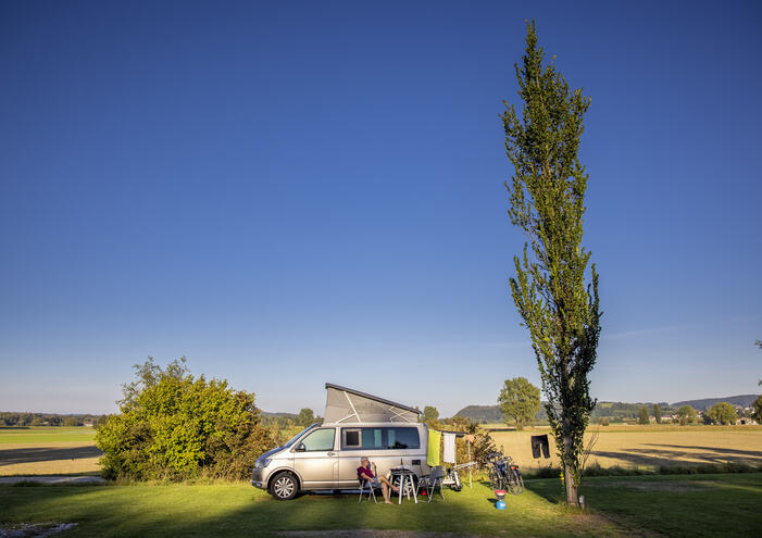 Entspannen Sie sich am naturbelassenen Flussufer, wagen Sie einen Sprung in den kühlen Rhein oder geniessen Sie ein Bad im angrenzenden öffentlichen Schwimmbad (für Campinggäste gratis).